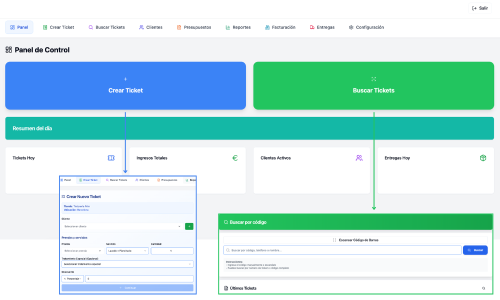 Crea tickets, clientes y artículos por categoría, genera presupuestos y facturas, automatiza la facturación, visualiza ganancias y maneja todo de forma sencilla e intuitiva.